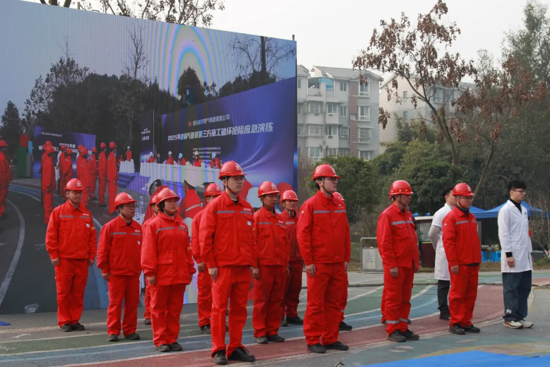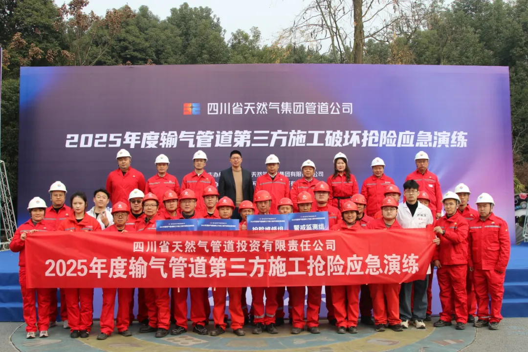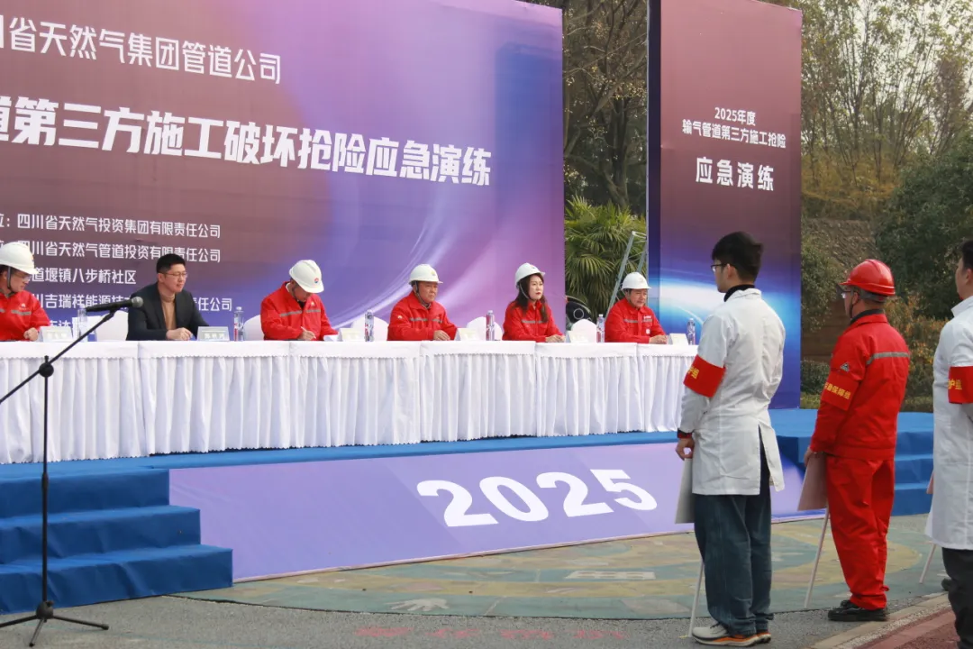 为践行“以演筑防、以练备战”理念,防范化解第三方施工对输气管道的安全风险,检验应急处置体系响应效率与协同能力,筑牢能源输送安全防线,2025年末,由四川省天然气投资集团有限责任公司主办、四川省天然气管道投资有限责任公司(以下简称“管道公司”)承办、四川吉瑞祥能源技术服务有限责任公司(以下简称“吉瑞祥能源”)管道项目管理三部、四部协办的2025年度输气管道第三方施工破坏抢险应急演练,在新场-三邑-郫县输气管道三道堰高后果区圆满举行。四川能源发展集团安全环保部高级主管郭秋鸿;四川省天然气投资集团有限责任公司党委副书记、总经理徐帆,副总经理粟文婷等领导莅临观摩指导。管道公司党总支副书记、副董事长、总经理缪建,副总经理唐刚,总工程师麦小攀;吉瑞祥能源党委副书记、纪委书记、常务副总经理陈建昌以及天然气集团相关部门和管道公司相关部门30余人参加应急演练。