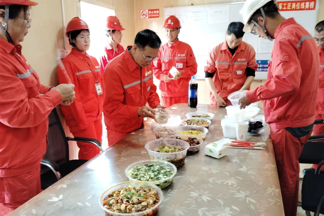 宴席间,氛围轻松而热烈。大家没有上下级的隔阂,有的是对工作的坦诚交流:领导们仔细倾听员工在井站日常运维、安全生产中的难点与建议,一同探讨优化工作流程、提升保障效率的办法;也有对生活的温情畅谈:从家乡的中秋习俗,到家人的近况,再到工作之余的兴趣爱好,家常话儿此起彼伏,欢声笑语驱散了井站的偏远与寂静。每一句问候、每一次畅谈,都拉近了彼此的距离,让坚守的日子多了份暖意,也让团队的凝聚力在不知不觉中愈发紧密。