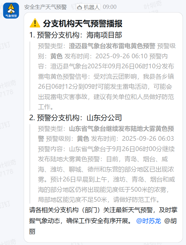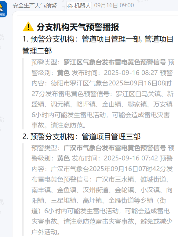 为应对季节性、突发性天气风险,公司在安全生产群内部署“安全生产天气预警机器人”,实现雷电、暴雨、大风、高温等异常天气的实时自动推送,为各分支机构提前部署防范措施、加强巡检值守提供了信息支撑,筑牢自然灾害预警防线。
