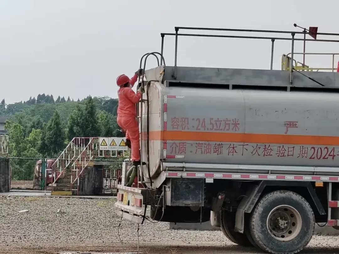 说到冬梅,总会想起2023年8月9日那个清晨,从值班室打开的门望出去我看到冬梅手脚异常利索攀爬上拉液车的梯子,在车顶上拿着一根很长很长的杆子打杆,然后又快速沿着梯子下来,去到储液罐出液口上锁打铅封。冬梅上下梯子的动作可谓行云流水、一气呵成、熟练至极。当她攀爬上拉液车时,我快步从值班室冲过去,想记录下那一刻,硬是没赶得上,视频没拍成,照片也只得了这草草的一张。